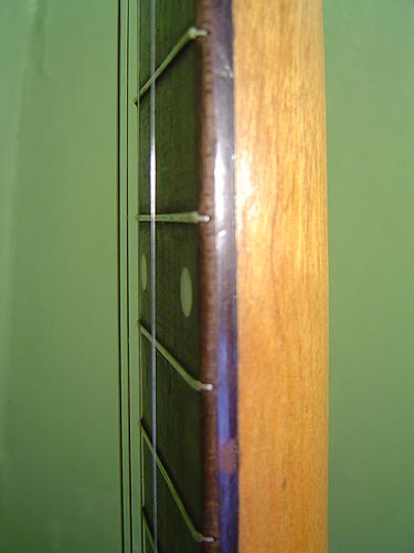 The various components, as restored, are in pretty good shape and have some unusual characteristics (like the 32 head hooks). Though unlabelled, the manufacturer is easiloy identified by the headstock design, which is stated as being a classical example of Lange's work. This model has a double spunover pot which increases the volume while maintaining the "integral tonering" sound - sweet but with good volume and sustain. The tuners are newer Grover tuners, probably updated many years ago and still do a fine job. The fretboard appears to be dyed pearwood and the neck looks like it may be cherry - both woods and applications were common during that period.
